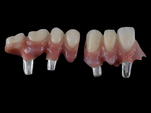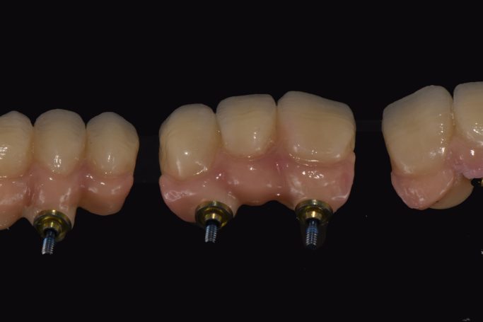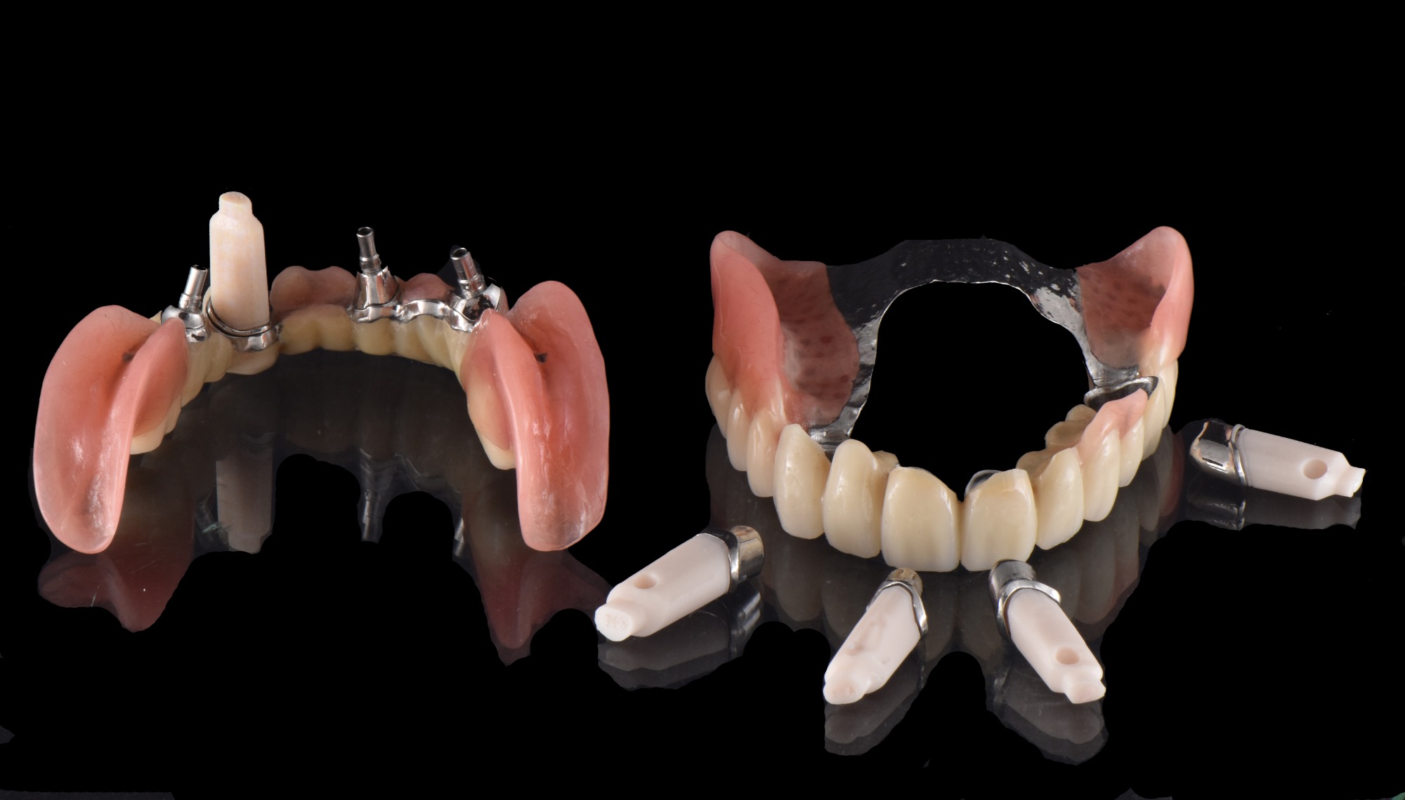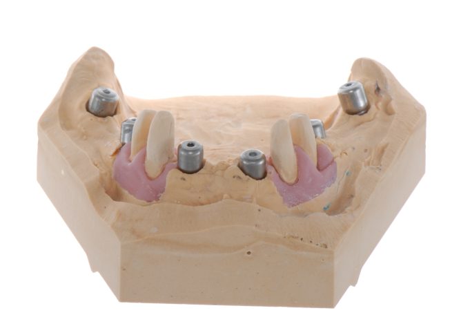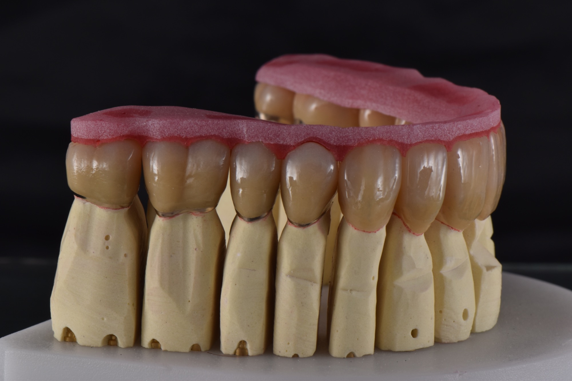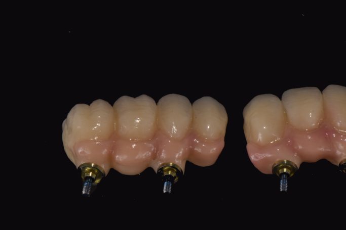 Implantatbrücke zur Wiederherstellung der Zahn- und Zahnfleischanteile mit verschraubten Brücken.