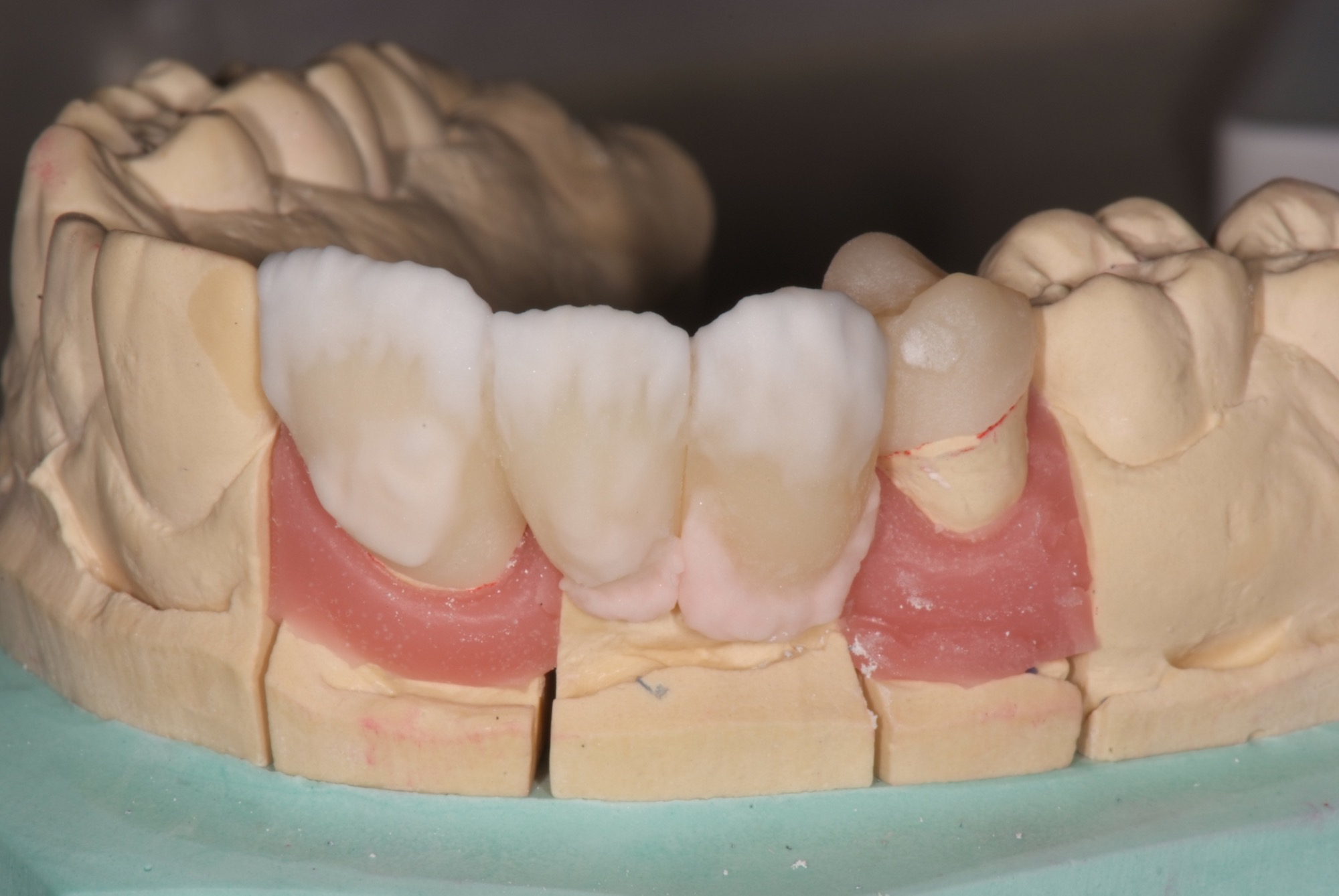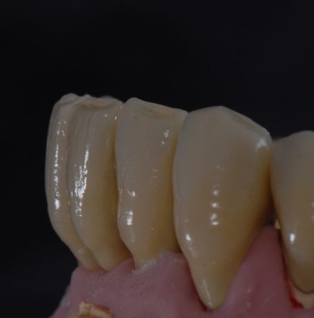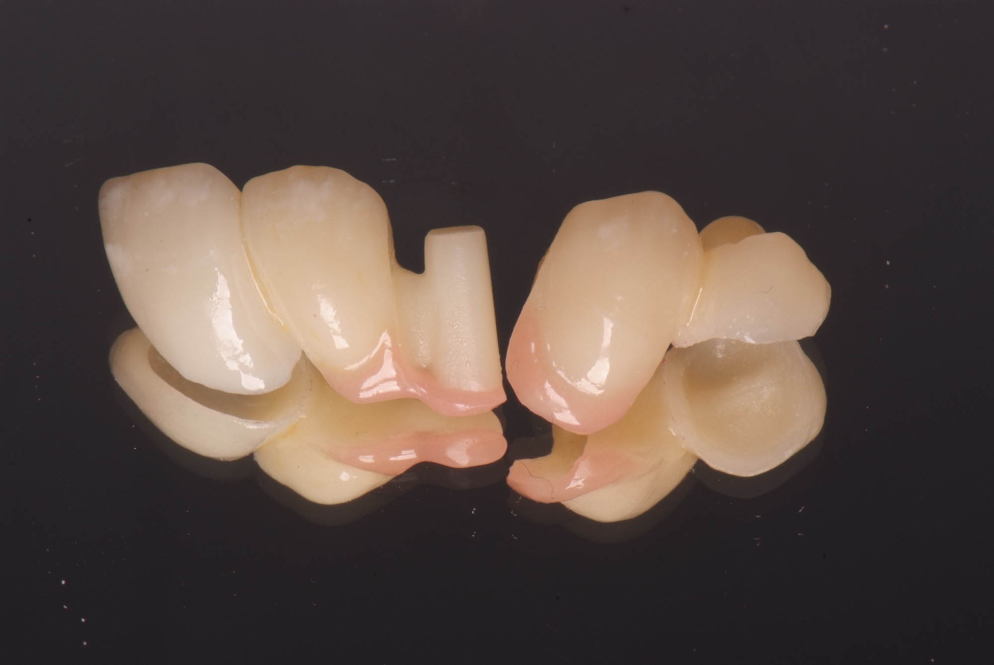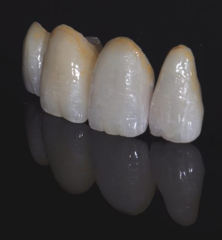 Vollkeramische Teilungsbrücke zum Ersatz der fehlenden Zähne und minimalinvasiver Verankerung.