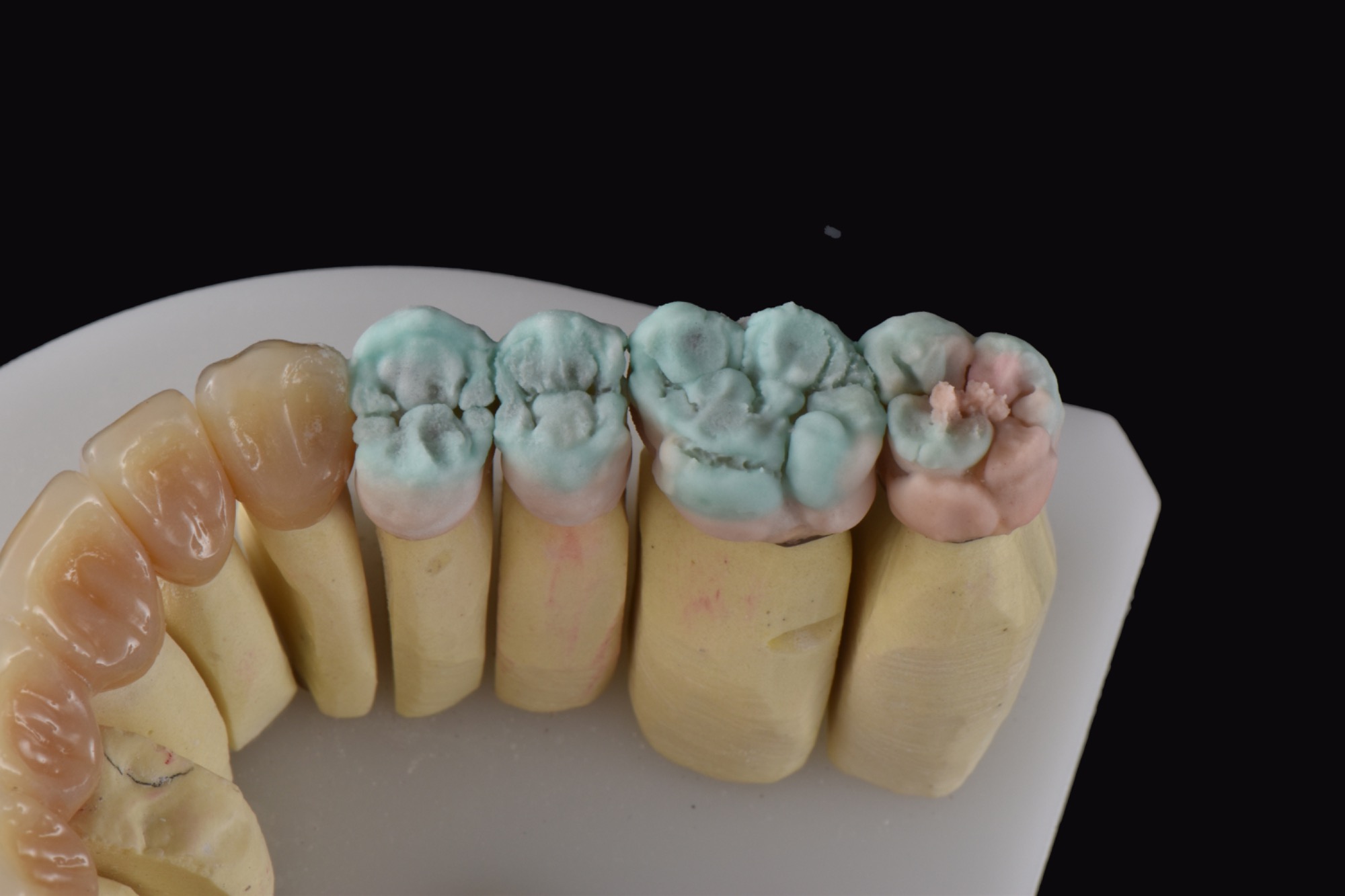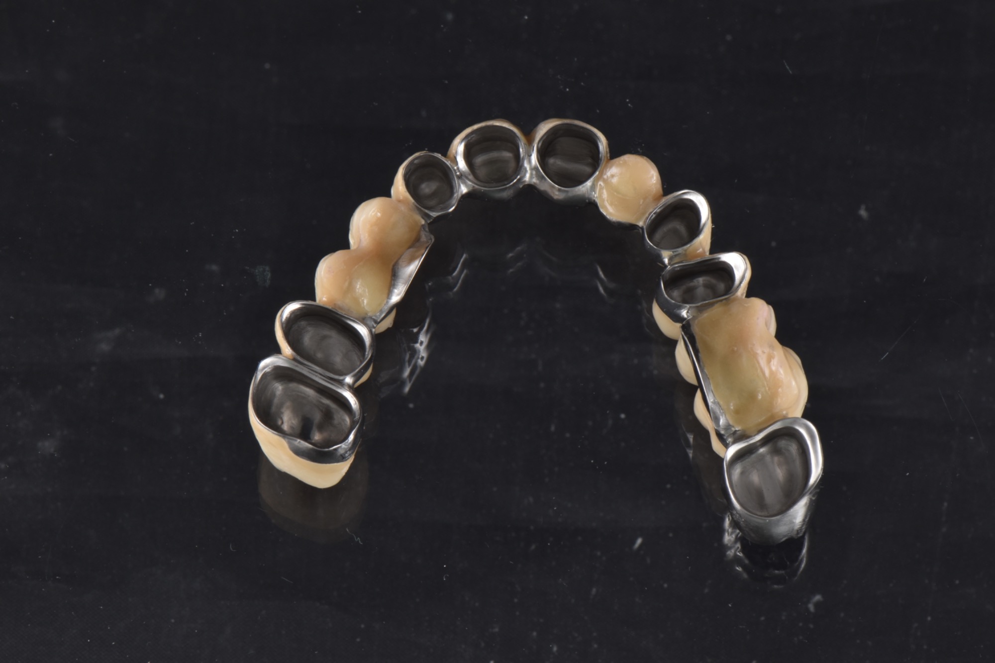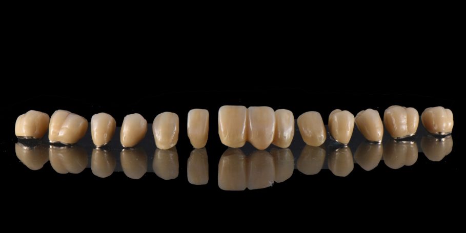 Kombination aus vollkeramischen Frontzahnkronen und metallbasierten Seitenzahnkronen mit dünn auslaufenden Rändern.