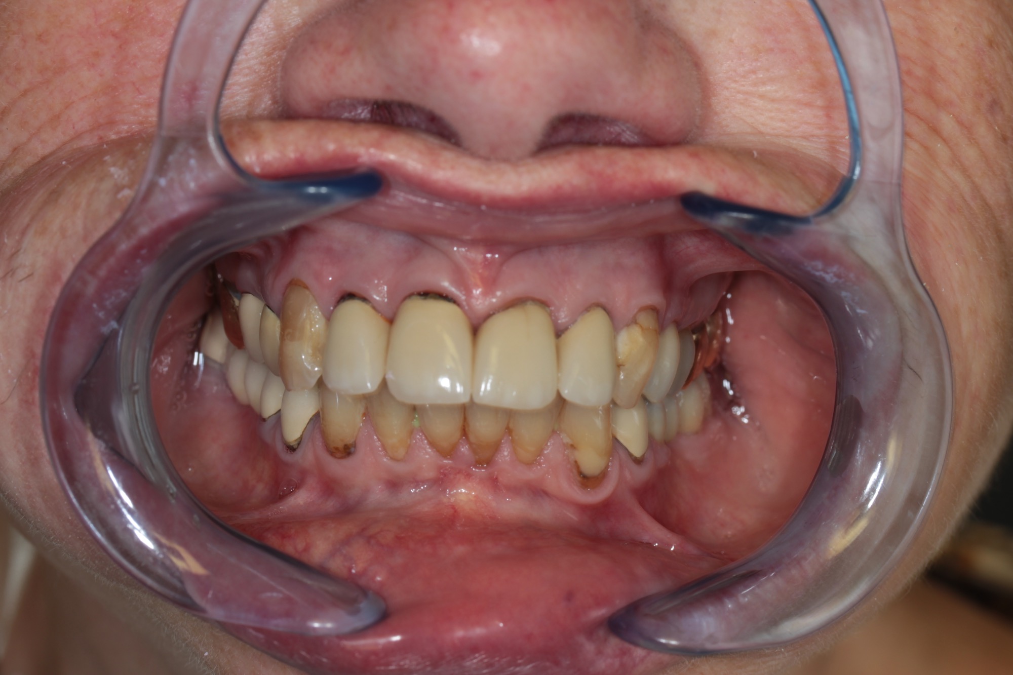 Kombination aus implantatverankerten Brücken und auf natürlichen Stümpfen verankerten Kronen.